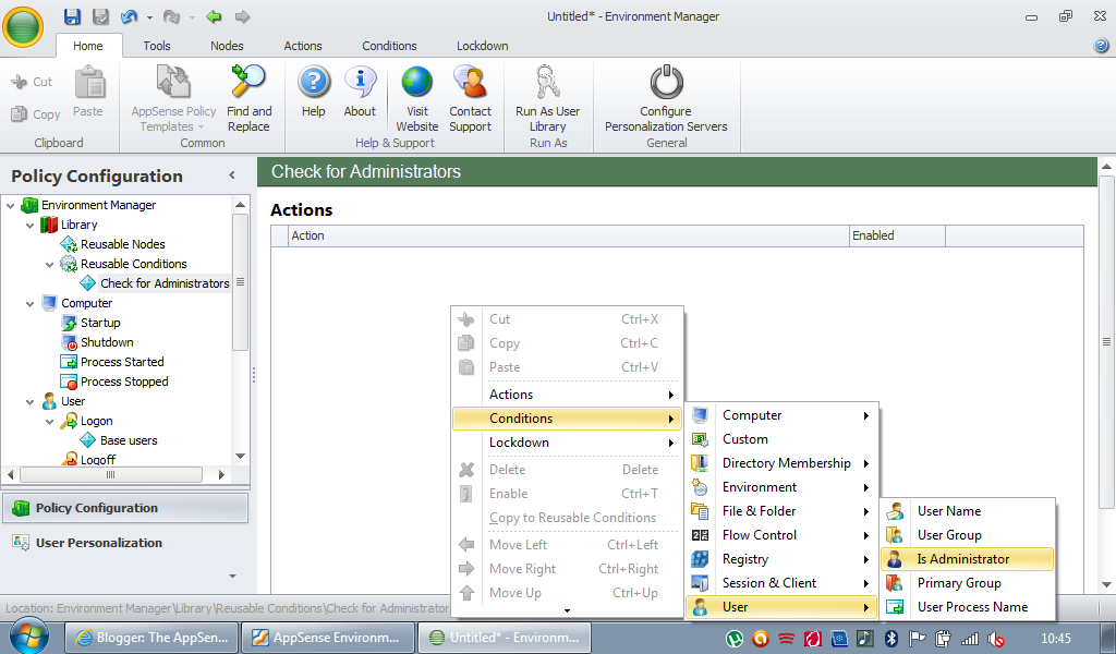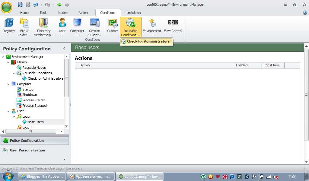 To save yourself the pain of having to create the same Conditions repeatedly, AppSense EM comes with a handy shortcut in the form of Reusable Conditions. They appear in the Library section in your Environment Manager Console window, and can be added to at any time you so wish.