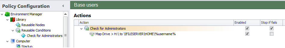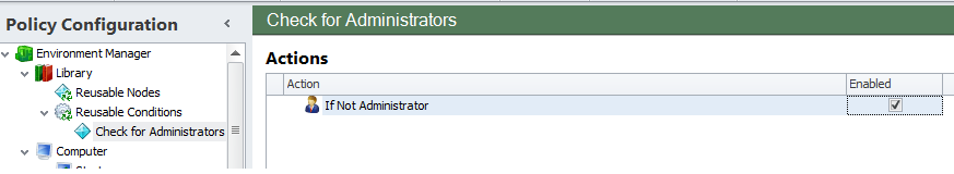 If you are putting together a detailed Environment Manager configuration, you may find yourself creating the same Conditions over and over again. A common example of this is the User | Is Administrator (False) condition – this is often used at the start of each Logon trigger to ensure the actions created do not apply to anyone in the local Administrators group.