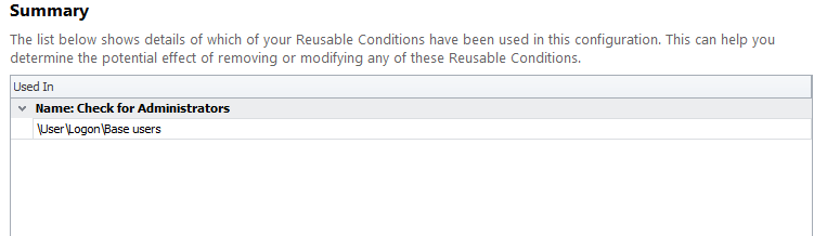 A final note about the processing of Reusable Conditions. When a user logs on, all the Reusable Conditions are processed initially and then cached ready for use if they are called at different trigger points from the configuration. To this end, putting together a huge amount of them may not be a good idea if you are sensitive to any increase in the logon time. Try and use a bit of common sense and only create the Reusable Conditions you need for the configuration in hand, rather than recreating lots you may never use.