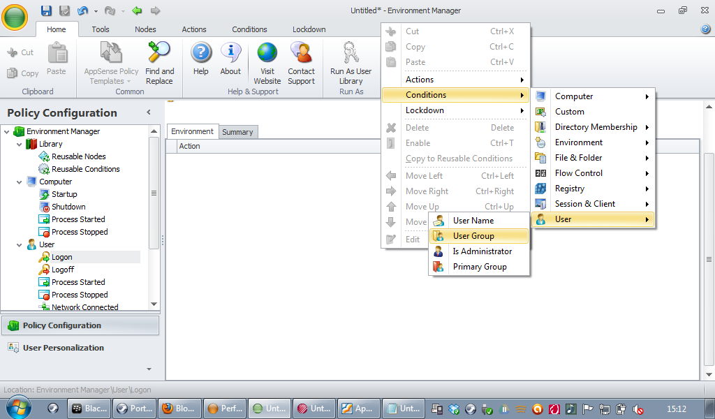 In Environment Manager we will need to set this using the Trigger Environment for the Logon trigger. We don’t put environment variables into sub-nodes – this causes refreshes to have an impact on the running of other Actions. In your Logon trigger, right-click in the Environment tab and choose Condition | User | User Group