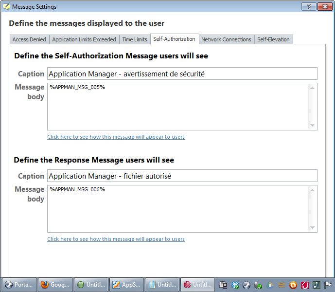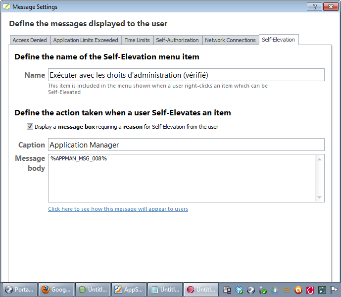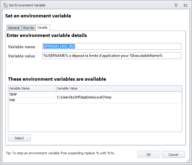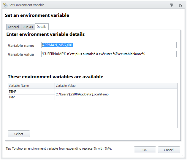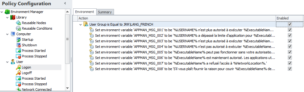So now, when a user logs on from the French language security group, EM will set these eight environment variables for the user that correspond to the messages that could be displayed by AppSense – specifically, in this case, by Application Manager.