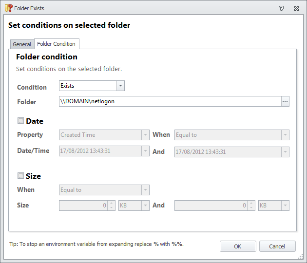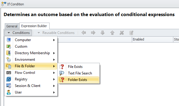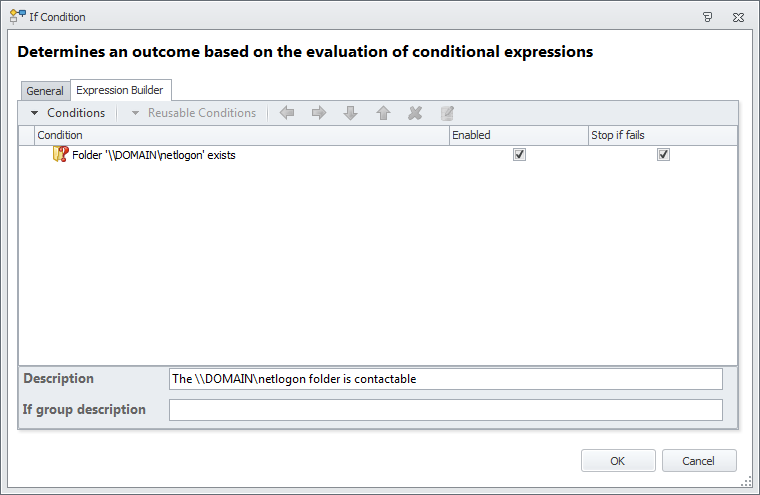 which opens the Expression Builder window. Into this we add a Condition in the usual way to check for, which in this case is the existence of the \\DOMAIN\Netlogon folder (obviously changed to suit your own environment)