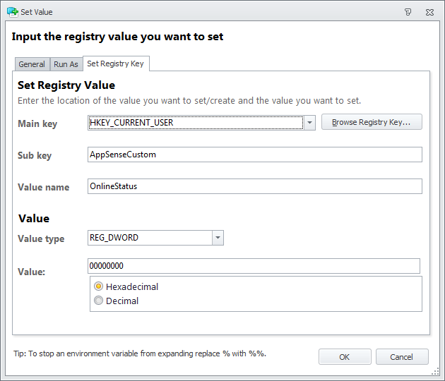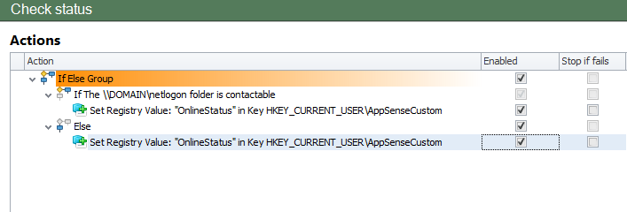 We will add an Action for the If section of the group to set a Registry value to indicate that the folder is contactable, and hence we are classifying the endpoint as Online