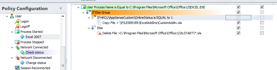In the above example, the major flaw is that in Luis’ case, if a user has Excel open during an Online session and then disconnects from the network without closing Excel, the add-in will remain loaded and crash. It’s a bit out of scope for this article, but you’d need to put together a Custom Condition (probably using PowerShell’s Get-Process cmdlet) to check for the excel.exe process during a Network Disconnected trigger event.