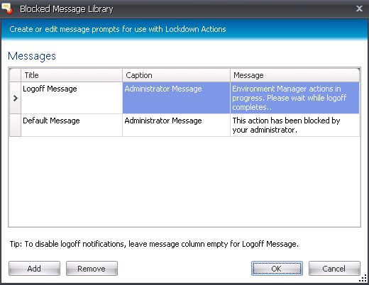 On the Lockdown tab, click the button saying Blocked Message Library (message to AppSense – this is where the confusion arises)