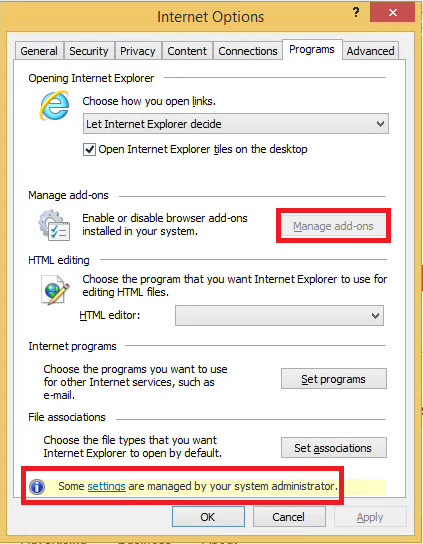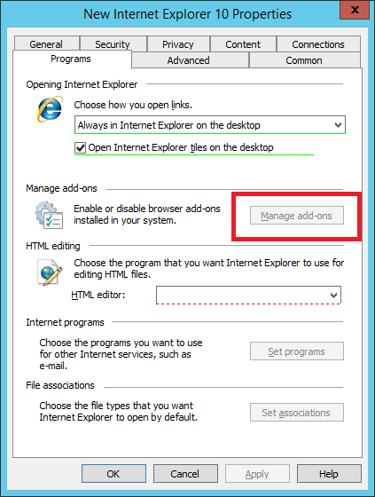 This isn’t something that can be easily gotten around unless you’re using a piece of software like AppSense, which can be used to selectively disable this part of the interface (see image below for an example of the interface with the Lockdown applied). In this case, we’ve disabled the Manage Add-ons item under the Tools button, and the Manage Add-ons item on the Tools menu. We could even go so far as to disable the Alt-X keystroke (the Tools shortcut key) within iexplore.exe, but with the options disabled this isn’t necessary.
