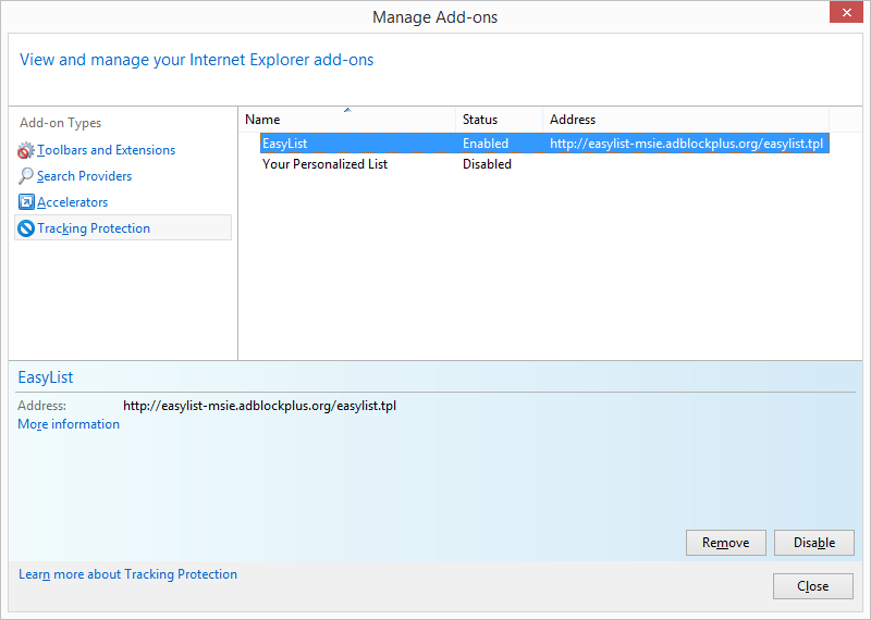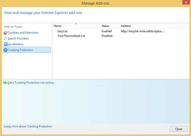 So it was quite surprising when I discovered that ad-blocking (or content filtering, to give it the correct term) had been part of Internet Explorer since IE9 in the form of Tracking Protection. Originally I suspected that Tracking Protection simply prevented websites from offloading your data to third-party websites (which is probably why I ignored it), but I was pleasantly surprised to find it did allow you to block content using an add-on called a Tracking Protection List (TPL). You can use the same list as Ad-Block Plus (the EasyList, which is the one we’ll use), so if you are using Firefox or Chrome with ABP you can configure the same level of protection for Internet Explorer using the built-in tools.