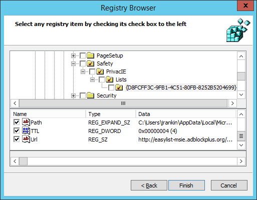 HKCU\Software\Microsoft\Internet Explorer\Safety\PrivacIE\Lists\{GUID}