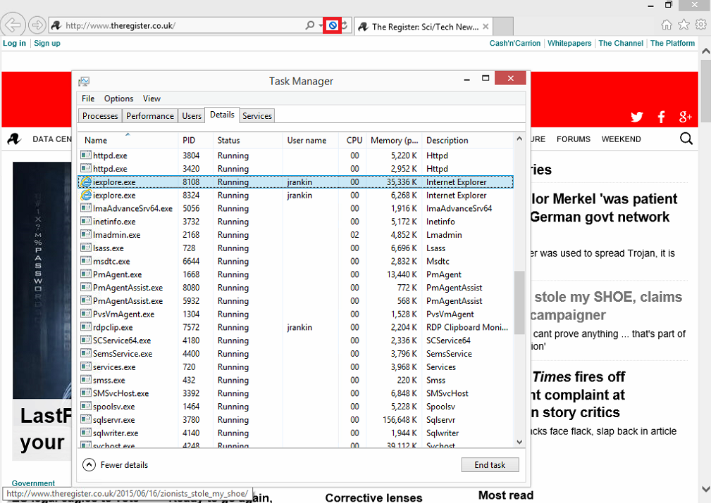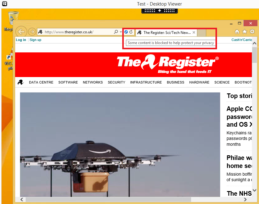 When I log in to the XenApp server, I can see that the files and Registry values are present, and the EasyList is configured correctly. Excellent! But more importantly, it blocks the ads on The Register (the little “content filter” icon – highlighted in the image below – proves that it is working)