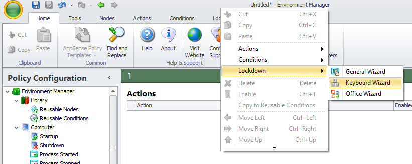 To create a Keyboard Lockdown item, right-click in the Action pane, choose Lockdown and then Keyboard Wizard