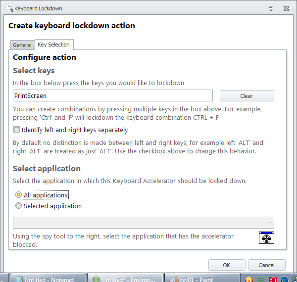In the first box you can simply enter the keystroke or keystroke combination that you want to lock out. There is also an option underneath to identify left and right keys (such as Shift, Alt and Ctrl) separately, if you need to lock them out on a particular basis. The key selection box also will successfully pick up special keys like the Windows and Apps keys, and combinations associated with them, such as Windows-M, Windows-L, etc. In the example below, we’ve used Print Screen, as a lot of enterprises seem quite keen to kill the functionality of this button.