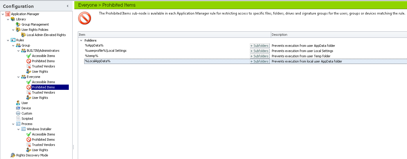 ….and if this is correct (which it will be, unless you’ve messed with the normal user profile settings), this is all you need to get Application Manager up and running. With SRPs, you need to explicitly disallow execution from the target folders to cover yourself (unless you’ve set the “only allow specified executables” policy, and that’s a nightmare to administer, believe me), but with Application Manager, you can activate the protection fully with a minimum of fuss. If a user drops the CryptoLocker executable in the %AppData% folder, Trusted Ownership will block it from executing.