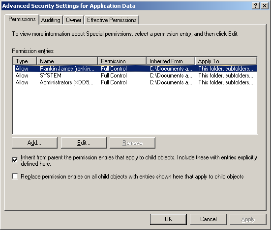 Now, the user’s %AppData% folder should normally have permissions like these, where ownership is set to the current user…