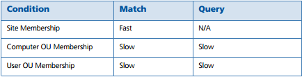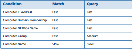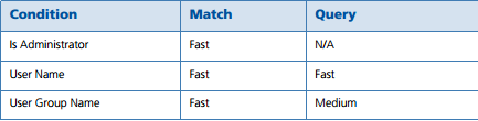 The various Conditions that you specify within your AppSense EM configurations take different amounts of time to process. To maintain the optimal time for processing of configurations, it is important to know the relevant speeds that each Condition is processed at. Once you are aware of these speeds, you can then streamline your configurations to ensure the best possible performance. As an example, if a configuration contains OR Conditions, you can group them in order of response time with the quickest evaluating first. If the first Condition matches, the configuration is not held up by the slower response time of the second Condition.