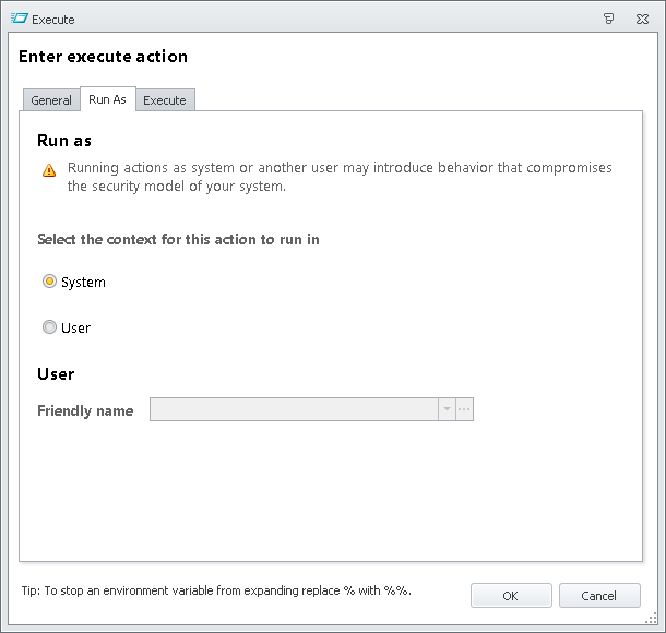 Set the Run As tab to execute as SYSTEM, as this is a high-privilege operation because of the file destination we are going to choose