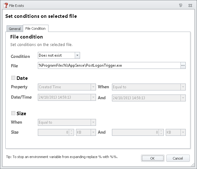If you’re going to do it through AppSense – which would be the best way, because it completely removes the requirement to maintain the source file on your endpoints – you would do it like so
