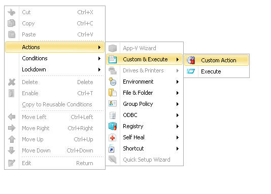 Now you’ve got the Trigger prepared, you can add as many Actions as you want as children of the Process Stopped Condition. Anything that the user needs to be set at logon, but doesn’t need to use immediately and/or slows your logon down, you can dump in here for processing after they think the logon has already finished!