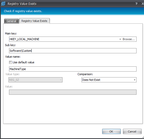 As I appear to be rather fond of If Else Groups at this moment in time I don’t see why I shouldn’t leverage another one for this situation 🙂 To start with, though, we will put in a check for the Registry value we are going to write. We only need to run this detection once, so once the Registry value is written for the machine type, we don’t want it ever to run again. So the If Else Group is going to be dependent on the non-existence of the Registry value