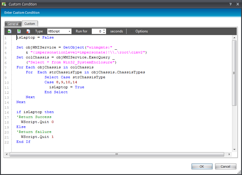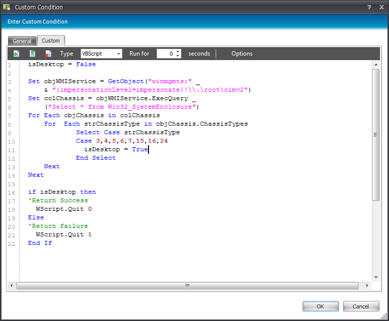So, with this in mind, I am going to create the Condition for my If clause as a Condition | Custom and use this bit of scripting to identify a desktop machine