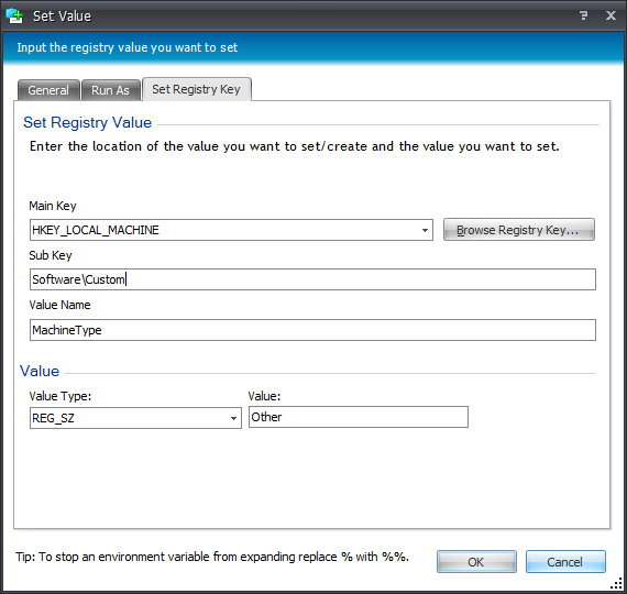 Finally, if the two Custom Conditions specified in our two clauses don’t return success, we will write the Registry value as OTHER