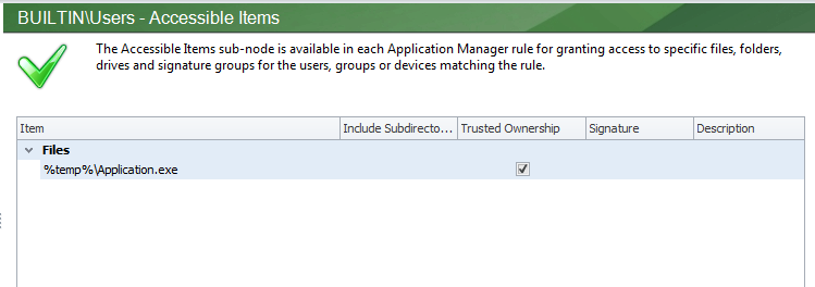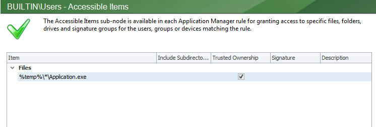 One final note – if you are writing rules for both ordinary desktop clients and Remote Desktop Services sessions and you need to allow something to run from %temp%, you’ll have to write two Accessible Items rules. One for the Remote Desktop Services session with the wildcard, and one for the ordinary desktop endpoints without the wildcard. Hopefully it will soon be fixed and you can make do with one rule for both.
